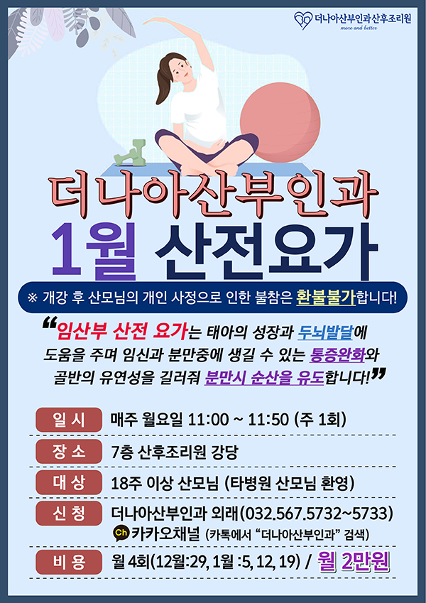 2026년 1월 산전 요가 모집 (타병원 산모님 환영) 페이지 정보 작성자 더나아산부인과 연락처 작성일 작성일25-12-15 09:36 목록 본문 카카오톡채널https://pf.kakao.com/_cMgwxb더나아산부인과의원인천광역시 서구 검단로 480 검단리치웰프라자 5층023)567-5732~3 목록